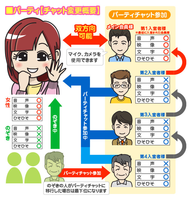 パーティチャット参加中の会員様の中で一番最初に入室されたメイン会員様のみ音声を使用できますが、