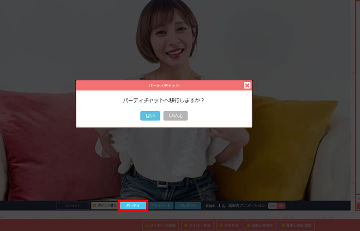 また、パーティーチャット中でも女の子と2人きりになりたいと思ったときは2ショットチャットに移行ができます。