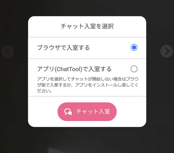 チャット入室時にブラウザ、アプリ(Chat Tool)のどちらで入室するか選択いただけます。