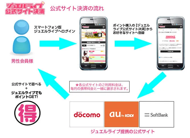 ジュエルライブ公式サイト決済は、ライブチャットジュエルライブが提携するdocomo/au/SoftBankの公式サイト